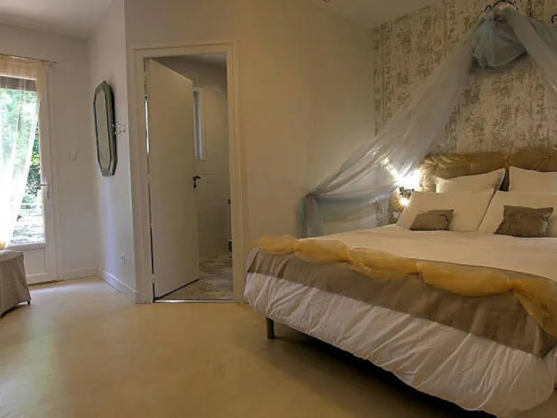 La maison comprend 3 chambres d'hôtes de 14m2 pour 2-3 personnes (avec salle d'eau, terrasse et entrée privatives) et possibilité de mettre un lit d’appoint, une cuisine équipée, un salon, un espace extérieur, un parking, un garage pour les vélos ou motos et une piscine que vous partagez entre résidents ! Possibilité d’indépendance complète. Idéal pour des nuits reposantes en pleine nature…Vous pourrez choisir parmi les 3 chambres :