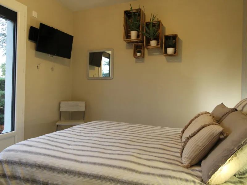 * chambre aloe vera : 1 lit 160x200 +1 lit d’appoint enfant : exposition sud, vue sur piscine lointaine