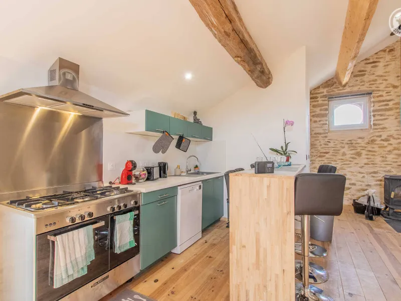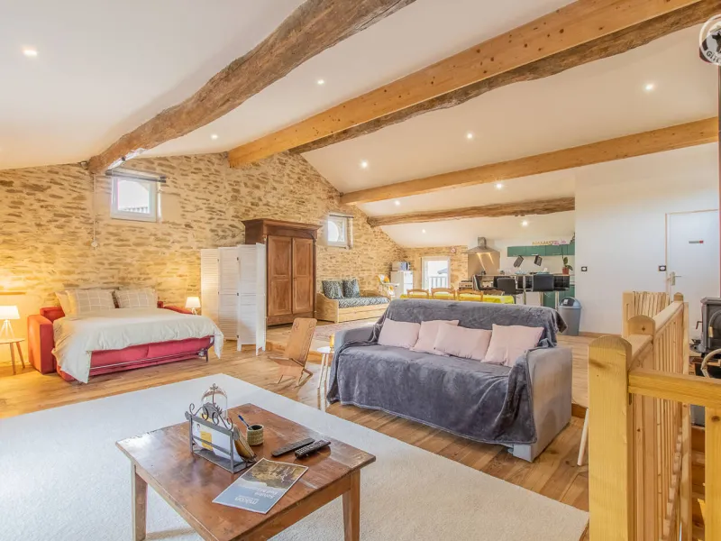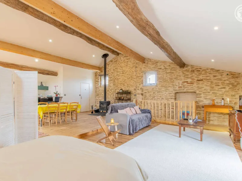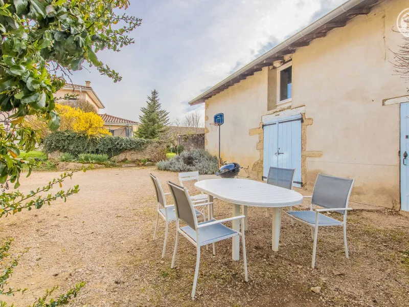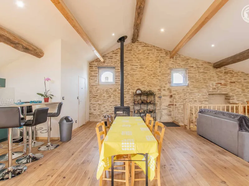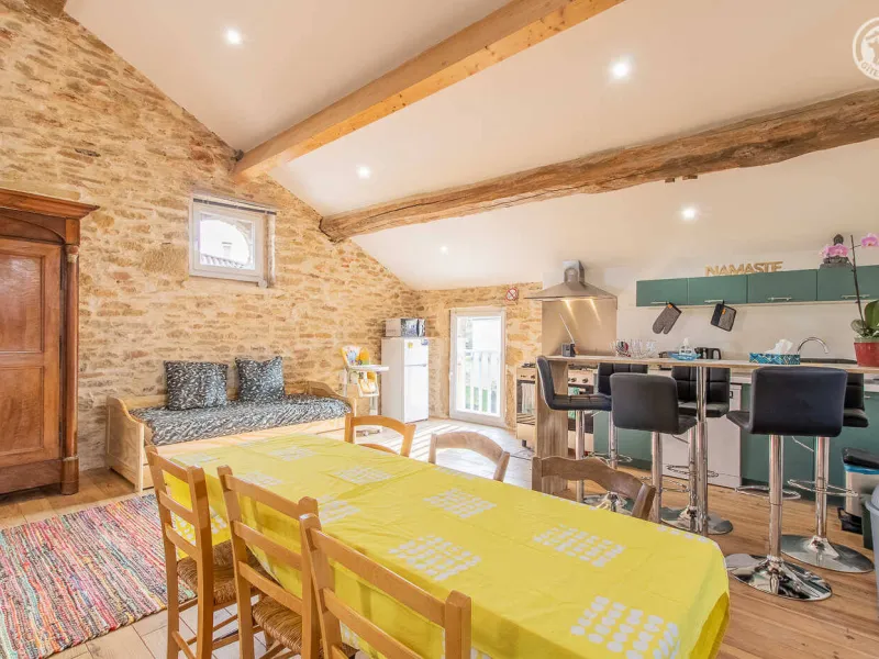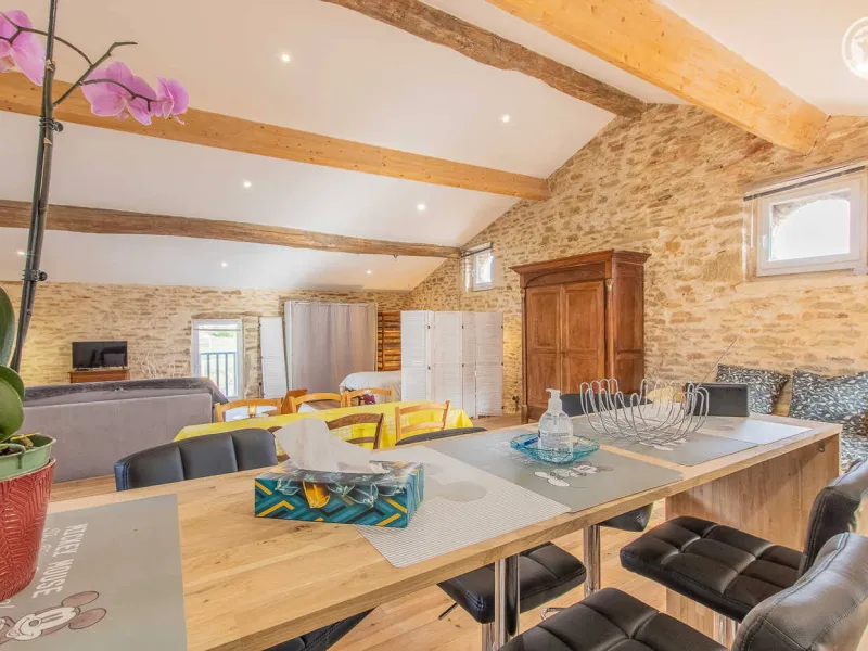 Fabienne, yoga teacher (personalized sessions on site possible on request) & Stéphane (sports & fitness enthusiast), open the doors of an authentic 19th century wine & agricultural outbuilding nestled on the edge of a small vineyard, at heart of a wine-growing village typical of the Mâcon countryside (home to a listed Romanesque church from the 12th century). Nestled at the foot of the famous Roche de Solutré, labeled "Grand Site de France" for its exceptional heritage and landscape riches (one of the largest prehistoric sites in Europe, rich in 50,000 years of human presence, offering a superb unobstructed view up to 'at Mont-Blanc!), Davayé has a hilly wine-growing setting, immersed in the heart of an immense preserved plateau of vineyards, close to several wild forest massifs. Sumptuous landscapes & panoramas to discover in the surrounding area. Large atypical "loft in the countryside" nestled under the roofs on the site of the old barn. Very nice volume. Warm country character with contemporary accents enhanced by careful heritage restoration (conservation of the rich traces of the original building: stone walls, stone & wood lintels, beams, original "bull's eye" windows adorned with bricks, etc.). Lots of charm & character. Cozy & cocooning atmosphere. Unusual & exotic. Pleasant & spacious “courtyard terrace” protected from view by the old surrounding wall of the property. Ping-pong & pétanque table possible on the courtyard side.Composition: Detached house adjoining the owners' home (total independence). Wifi (fiber). Heating by wood stove. Ground floor: laundry area. 1st floor: living room-kitchen-lounge on a large open plan (double bed 140x190cm + double sofa bed 140x190cm + 2 single pull-out beds 90x200cm as extra), bathroom (shower/WC). Terrace (gravel) + bicycle storage + private parking. Courtyard shared with owners. Supermarket 4 km. All amenities 6 km. Gite labeled “Accueil Vélo”