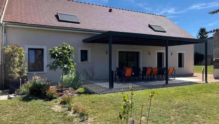 Authentic country barn dating from the early 20th century, fully restored with care, revisited as an ultra-comfortable holiday home, nestled in the quiet "backyard", on the edge of a mini pasture welcoming sheep in season, in the heart of a peaceful little typical village & shops (including a mini-market). Total tranquility in the heart of the preserved Bresse countryside, plains of fields of crops & gentle meadows dotted with bucolic rivers & fish ponds, close to several vast wild forests (to explore on foot or mountain bike), a stone's throw from the banks of the Doubs (paradise for kayakers & ultra-renowned fishing site for its famous catfish, pikeperch or carp) remarkable ecosystem partly classified as a "Natura 2000 Zone" for its exceptional ornithological reserve rich in 160 species and its very rare plant varieties (various other natural areas protected in ZNIEFF to discover in the territory). Very comfortable cottage. Large living area (78m²). Spacious and bright. High-quality amenities. Warm, contemporary country style, blending tradition and modernity in a peaceful, Zen atmosphere. Plenty of charm. Cocooning, cozy, and comfortable. Large terrace (exposed or shaded) opening onto a pleasant 1000m² garden, lawned and planted with trees (mirabell and fig trees / picking possible), offering a pétanque court backing onto a covered terrace equipped with an outdoor relaxation lounge.